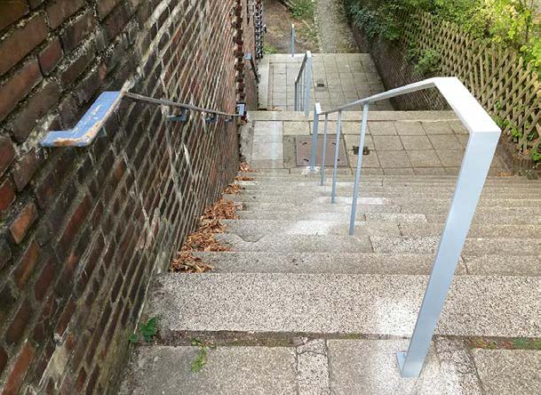 Der zweite Handlauf ist fertig und bereits montiert. Er besteht aus drei Teilen, da die beiden Zwischenpodeste ausgelassen werden, Verwendet wurde ein ca. 12 mm starker Rechteckflachstahl, geeignete Zwischstützen sorgen für die notwendige Stabilität. Altes und neues Geländer haben einen lichten Abstand von ca. 82 cm, so dass man sich bei der Treppennutzung gut beidhändig festhalten kann. Die Oberfläche ist verzinkt, pulverbeschichtet und mit einem