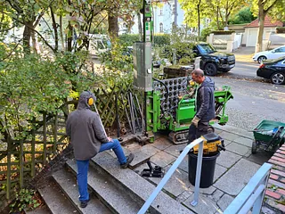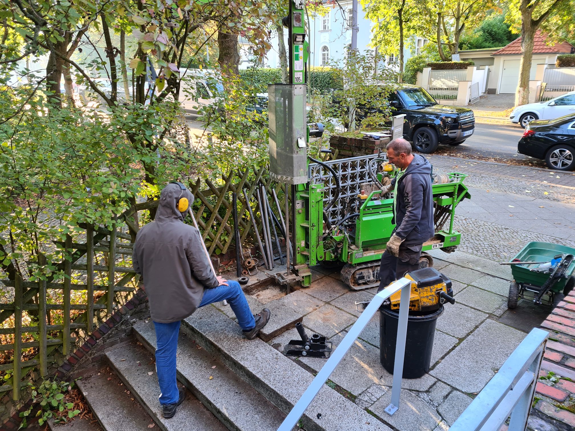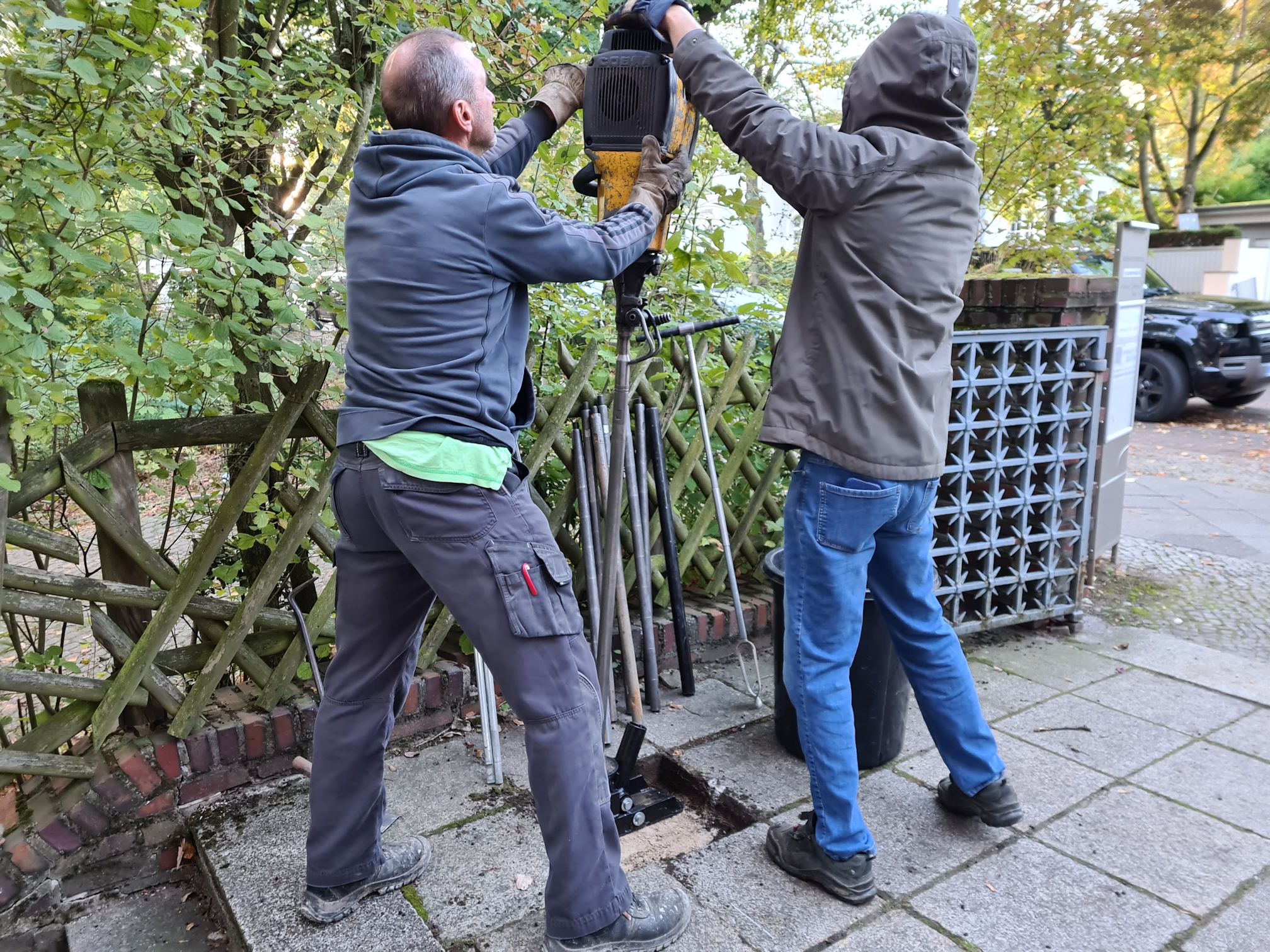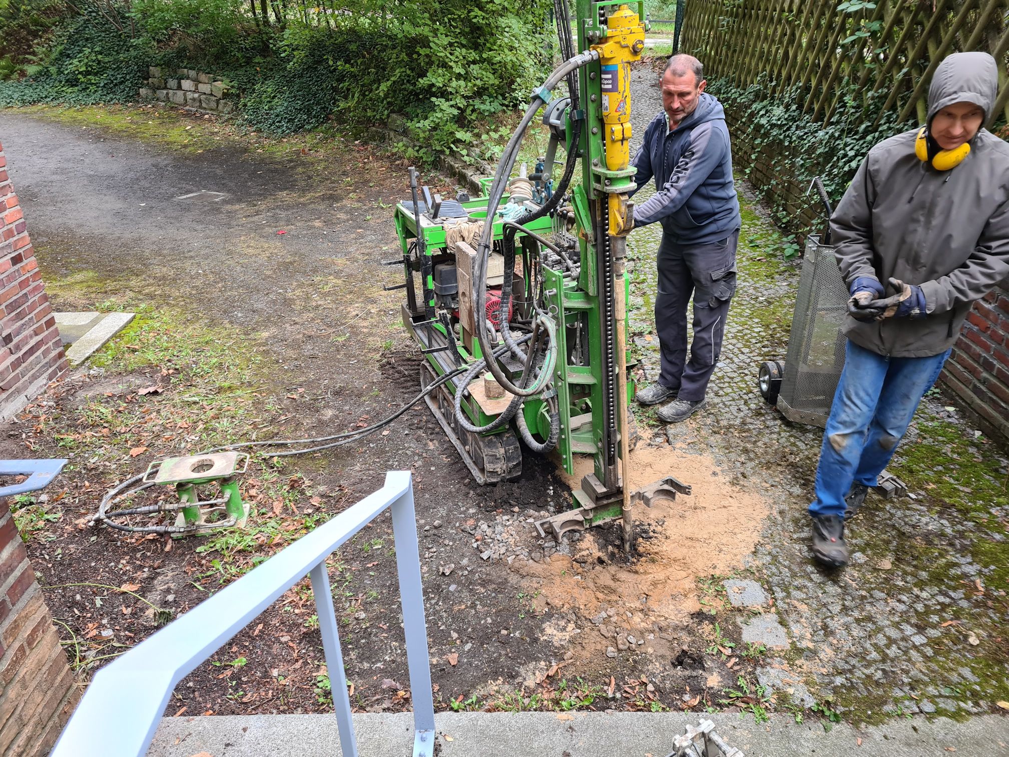 Die Lösung dieses Problems haben wir darin gesehen, das die Stützen der Fahrschienen nur auf den Podesten und nicht auf den Treppenstufen verankert werden, was laut Auskunft der Fachfirmen kein Problem darstellt. Die Treppe verfügt über vier Podeste, jeweils einer am Anfang und Ende der Treppe und zwei Zwischenpodeste. Aber auch diese Ebenen müssen untersucht werden, auch wenn es sich hierbei nicht um historischen Baugrund handelt. Zum einen muss ein Statiker die Treppenebenen untersuchen, zum anderen muss vorher ein Bodengutachten erstellt werden. Der Bodengutachter war nun vor Ort und hat mit Hilfe von Bohrungen in bis zu 8 m Tiefe Bodenproben zum Analysieren entnommen. Diese Analyse ergab Folgendes: