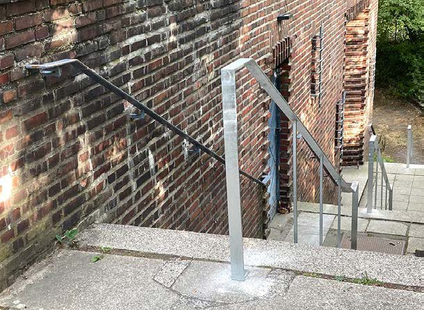 Metallschutzlack versehen. Die Farbe entspricht dem restauratorisch ermittelten Farbton des Originalhandlaufs. Dessen Oberfläche hat durch Witterungseinflüsse seinen Originalfarbton verloren, wird aber demnächst entsprechend aufgearbeitet.