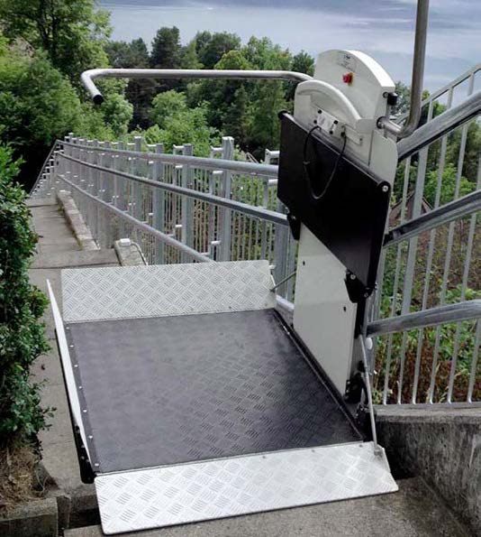 Das zweite Geländer nützt leider den Rollstuhlfahrern gar nicht. Für diesen Personenkreis wollen wir einen Treppenlift installieren. Dieser Lift soll auf seiner Plattform (Beispiel s. Foto) Personen befördern, die auf einen Rollstuhl oder Rollator angewiesen sind. Wir haben zwei Firmen gefunden, die uns einen solchen Lift liefern und montieren würden, allerdings gibt es im Vorfeld diverse Probleme in technischer, finanzieller und rechtlicher Hinsicht zu klären.