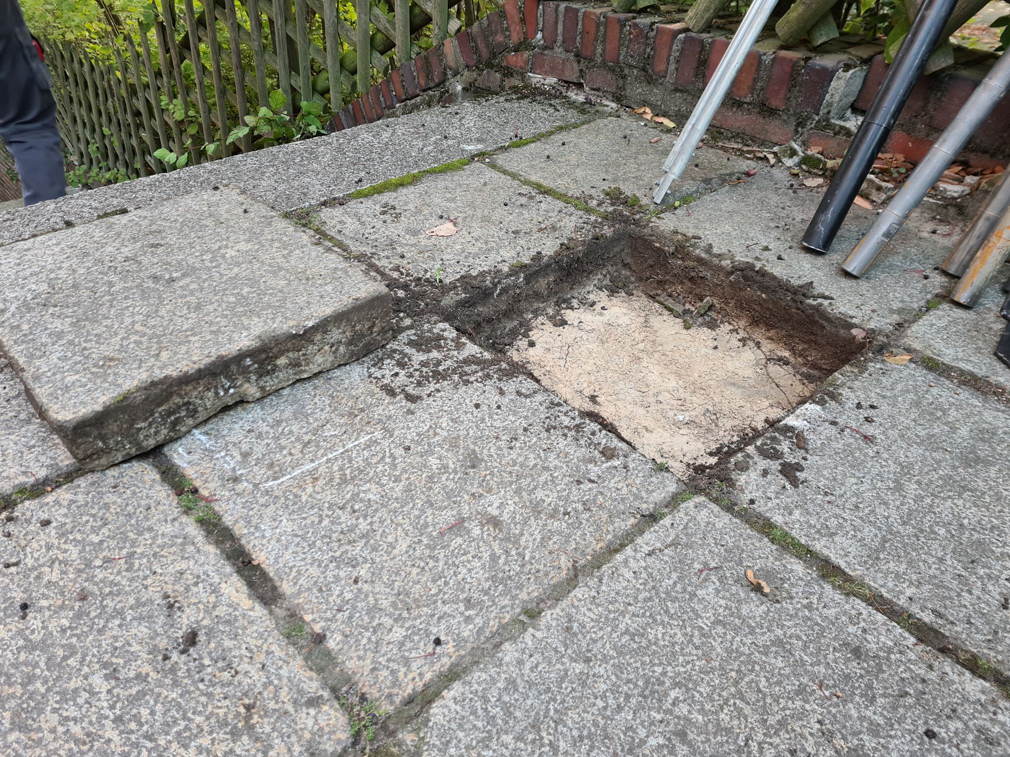 Ob die vorhandene Bausubstanz allerdings in der Lage ist, das schwere Gewicht einer solchen Anlage zu verkraften, musste noch untersucht werden. Dazu wurde eine Treppenstufe vorübergehend entfernt, um den Untergrund näher untersuchen zu können. Diese Untersuchung hat ergeben, dass die aus Granit gefertigten Treppenstufen nur auf Sand liegen. Ddas desolate Fundament ist nur in Resten zu erkennen. Die Stufen sind auch nicht unter einander verbunden, sie überlagern sich horizontal um ca. 2 cm. Einige Stufen haben Kontergefälle, dies begünstigt das Eindringen von Wasser in der Spalte zwischen Stufen sowie die Entstehung von Frostschichten (erhöhter Rutschgefahr) bei niedrigen Temperaturen. Die Treppe selbst ist zwar nicht gefährdet, die Eigenlast des Plattformlifts plus das Gewicht eines ggf. elektrischen Rollstuhls und einer Person verursacht temporäre Punktlasten bis zu 500 kg beim "Vorbeifahren“ des Plattformlifts, so dass es zumindest fragwürdig ist, ob die Treppenstufen dies aushalten können.